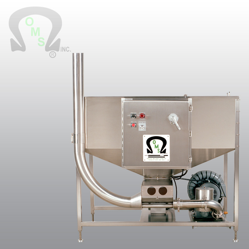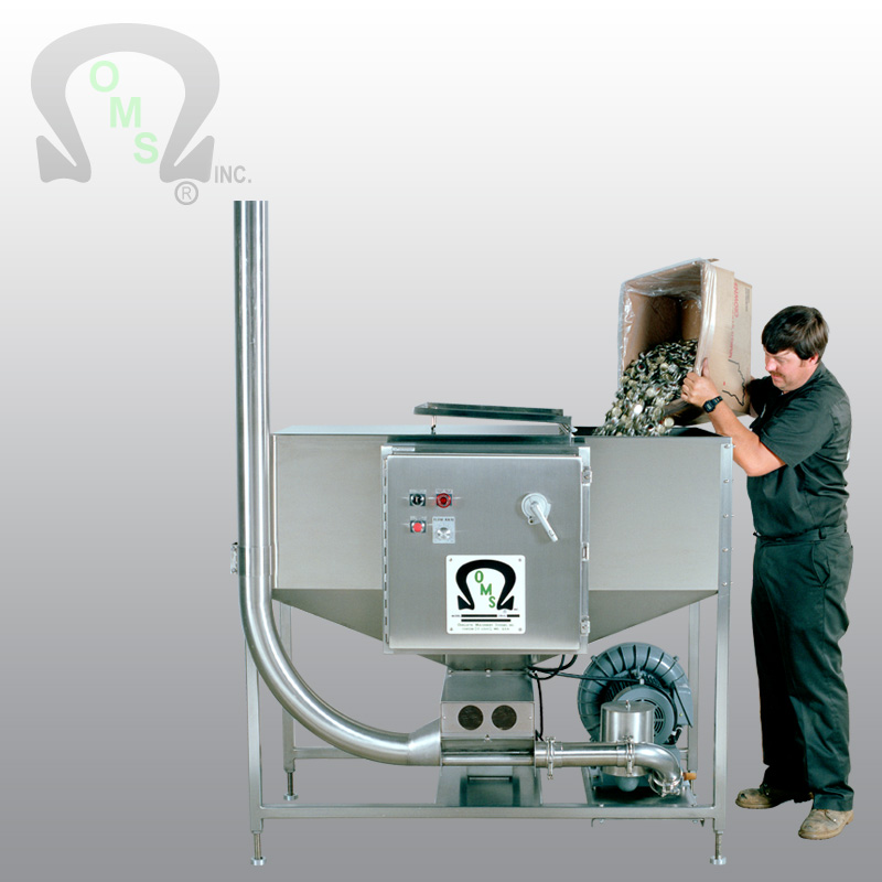 The OMS automatic dispenser and pneumatic conveyor system eliminates unsafe work and thereby decreases your company’s liability risk. This system is pre-fitted/pre-wired/factory pre-tested system, equipped with NEMA 4 control panel complete with fusible disconnect, programmable controller, motor starter, terminal blocks and associated components.